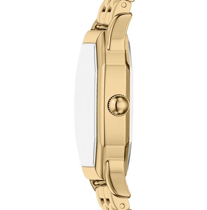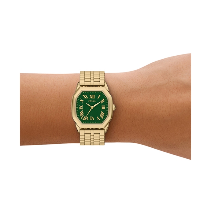An octagonal gold-tone case sets a geometric tone, paired with a textured green dial that adds dimension and depth. The matching gold-tone stainless steel bracelet adds cohesion to the design and features a double-press buckle for a secure fit. Thoughtful proportions and clean lines create a balance between distinctive shape and understated details.