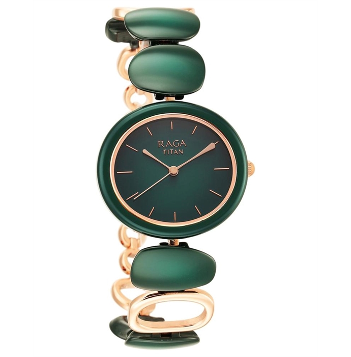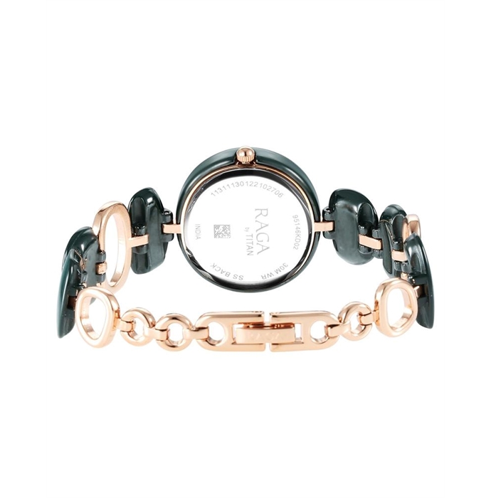 Titan Raga Ceramics Quartz Analog Green Dial Two Toned Rose Gold and Green Metal Strap Watch for Women - NS95146KD02