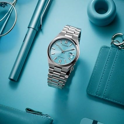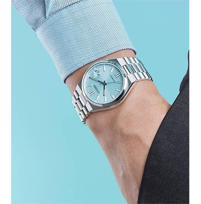 Discover Citizen watch for men, featuring a blue dial, a silver strap made of stainless steel in a round case. Built with sapphire glass and stainless steel body to balance clarity and durability. Dimensions include 40 mm dial size, 20 mm strap width, 12 mm profile for comfortable wear. Key features: automatic movement, analog display, 5 atm water resistance. A secure folding clasp ensures a dependable fit.