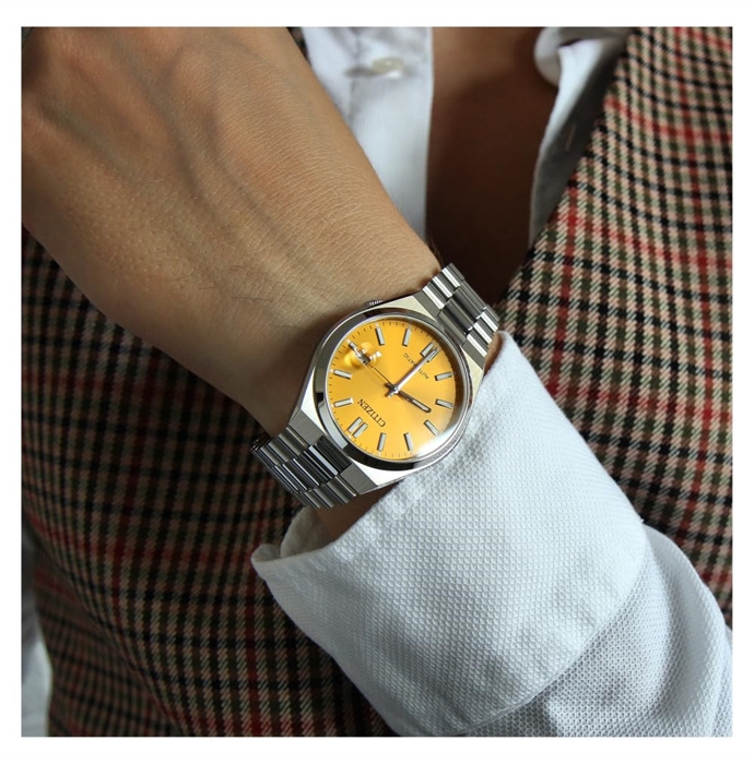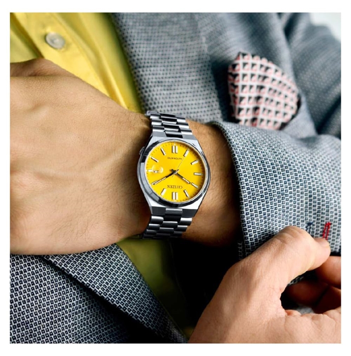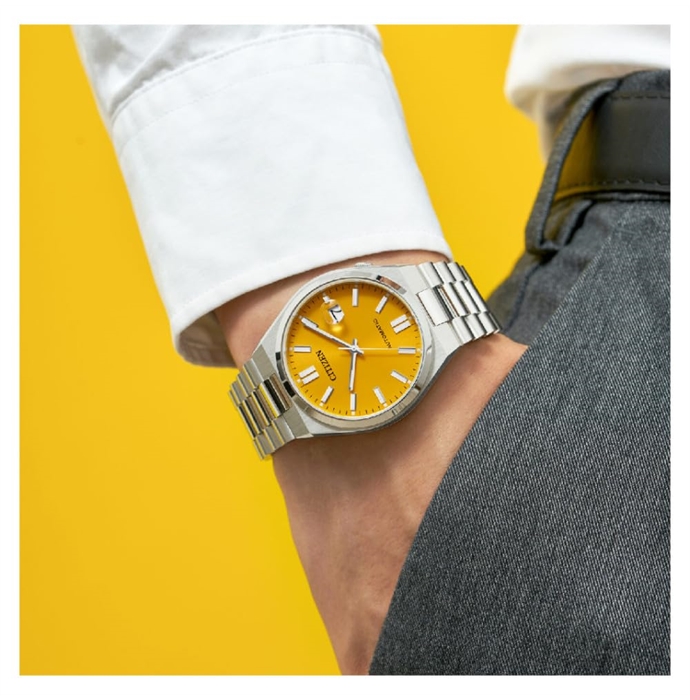 Discover Citizen watch for men, featuring a yellow dial, a silver strap made of stainless steel in a round case. Built with sapphire glass and stainless steel body to balance clarity and durability. Dimensions include 40 mm dial size, 23 mm strap width, 12 mm profile for comfortable wear. Key features: automatic movement, analog display, 10 atm water resistance. A secure folding clasp ensures a dependable fit.